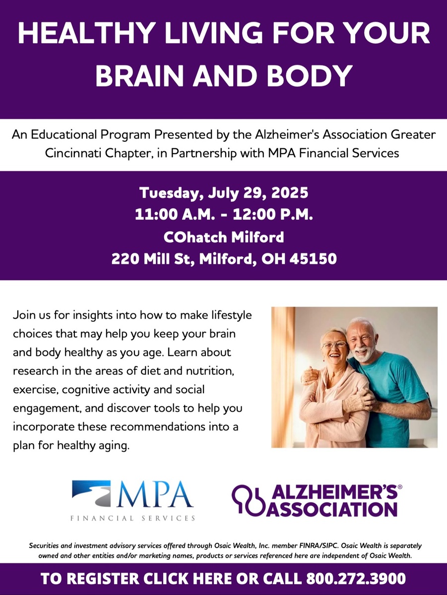 Please join me on Tuesday, July 29 for Healthy Living for Your Brain and Body with Kelsey Nihiser from Alzheimer's Association of Cincinnati. This FREE hour long presentation will give you new understanding of the relationship between brain and body and share tips for healthy aging.