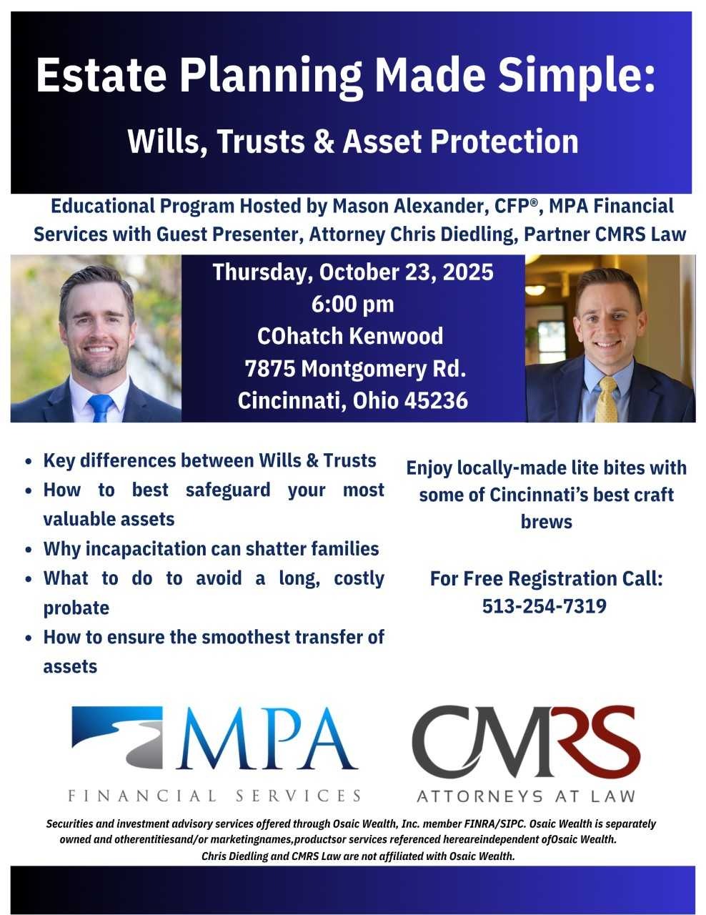 One night. Two Experts. Join us to learn how to protect what you have built for your family on Thursday, October 23 at 6pm at COHatch Kenwood. Christopher M. Diedling and I will bring you one hour of powerful information on creating the right estate plan for you.
